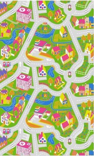 Коротко: «Детский 3D ковер с дорогами КИНДЕР Городок с дорогами 52810» (КИНДЕР, ОАО Ковры Бреста) — ковер для детской, комнаты. материал: полипропилен, стиль: детский, цвет: разноцветный, ворс: 10 мм, плотность: 224000 точек/м², основа: джутовая, подходит для детского интерьера, страна производства: Белоруссия.