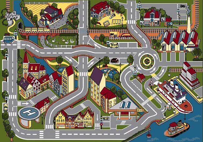 Коротко: «Детский ковер ГОРОДОК с дорогами у моря MANGO 11296-130» (KOLIBRI, Карат) — ковер для детского сада, детской. материал: полипропилен, стиль: детский, цвет: разноцветный, ворс: 10.5 мм, основа: джутовая, подходит для детского интерьера, страна производства: Украина.