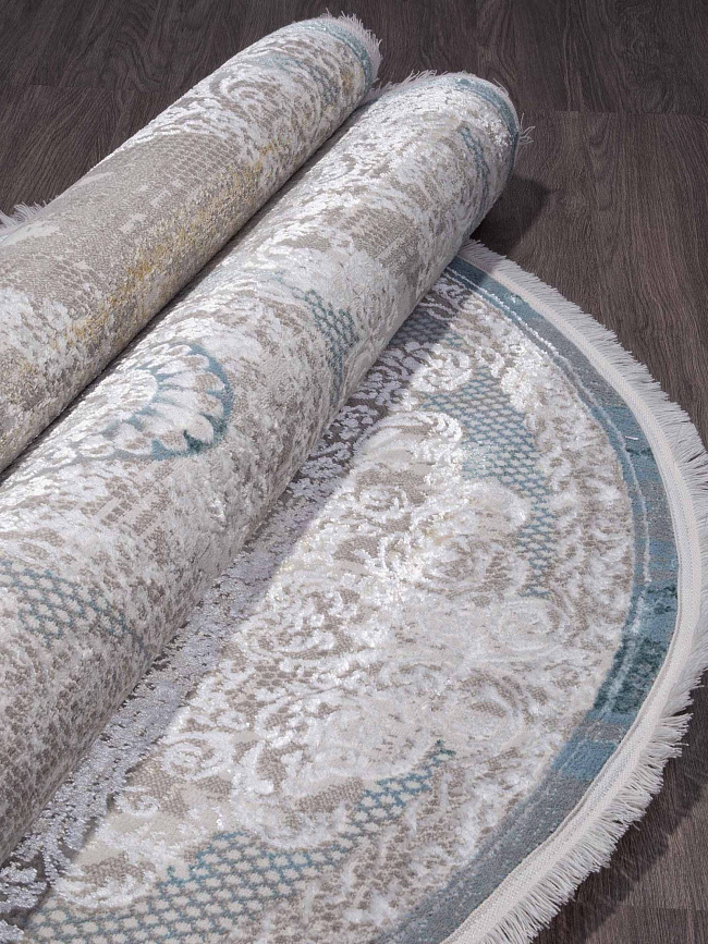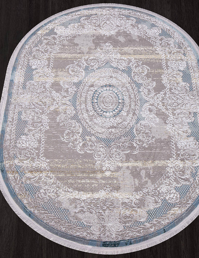 Коротко: «Ковер AJMAL LP 289 CREAM / TURQUOISE Овал» (AJMAL, SIRMA, Турция) — ковер для дома, гостиной. материал: полиэстер, стиль: в классическом стиле, цвет: кремовый, синий, серый, ворс: 10 мм, плотность: 462000 точек/м², основа: джутовая, ориентирован на классическую подачу, страна производства: Турция.