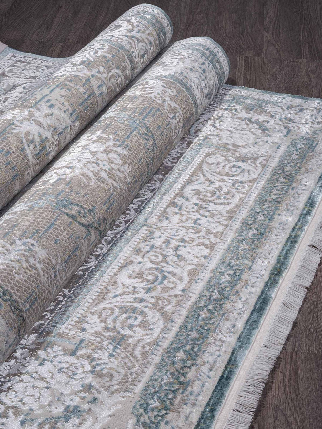 Коротко: «Ковер AJMAL LP 292 CREAM / TURQUOISE» (AJMAL, SIRMA, Турция) — ковер для дома, гостиной. материал: полиэстер, стиль: в классическом стиле, цвет: кремовый, бежевый, голубой, ворс: 10 мм, плотность: 462000 точек/м², основа: джутовая, ориентирован на классическую подачу, страна производства: Турция.