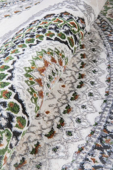 Коротко: «Ковер Amira 4836A D. Blue-L. Grey (зелёный) Круг» (Amira Round, Elisa Rugs, Турция) — ковер для дома, гостиной. материал: полиэстер, стиль: в классическом стиле, цвет: кремовый, зеленый, ворс: 9 мм, плотность: 528000 точек/м², основа: 100% Хлопок, ориентирован на классическую подачу, страна производства: Турция.