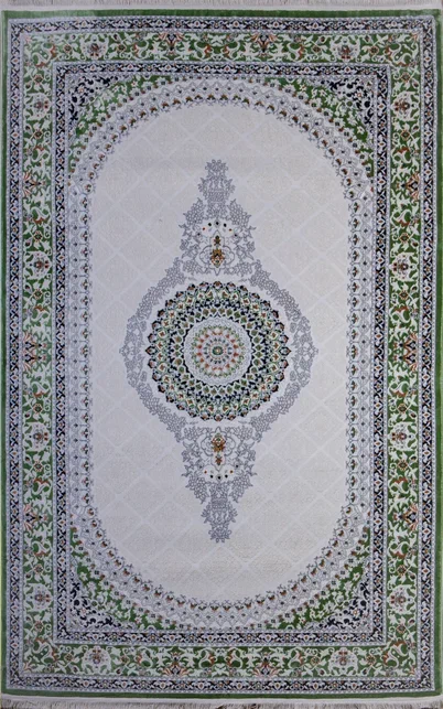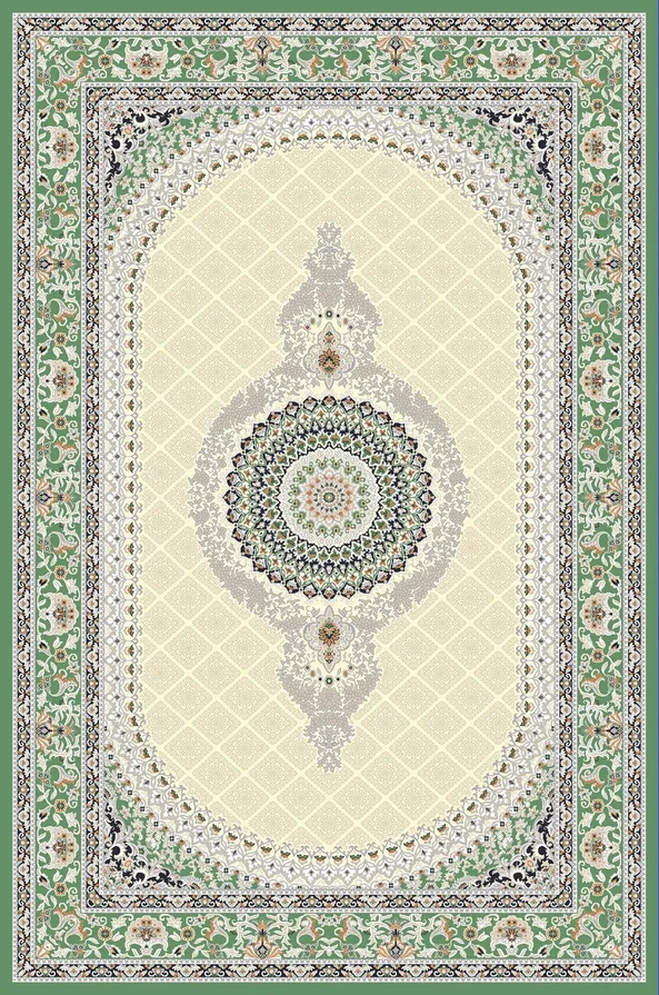Коротко: «Ковер Amira 4836A D. Blue-L. Grey (зелёный)» (Amira, Elisa Rugs, Турция) — ковер для дома, гостиной. материал: полиэстер, стиль: в классическом стиле, цвет: кремовый, зеленый, ворс: 9 мм, плотность: 528000 точек/м², основа: 100% Хлопок, ориентирован на классическую подачу, страна производства: Турция.
