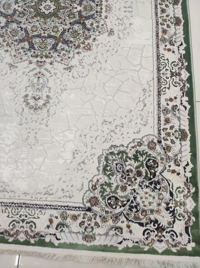 Коротко: «Ковер Amira 4922A D. Blue-L. Grey (зелёный)» (Amira, Elisa Rugs, Турция) — ковер для дома, гостиной. материал: полиэстер, стиль: в классическом стиле, цвет: кремовый, зеленый, коричневый, ворс: 9 мм, плотность: 528000 точек/м², основа: 100% Хлопок, ориентирован на классическую подачу, страна производства: Турция.
