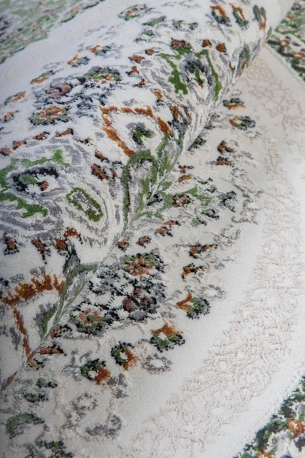Коротко: «Ковер Amira 4923A D. Blue-L. Grey (зелёный) Круг» (Amira Round, Elisa Rugs, Турция) — ковер для дома, гостиной. материал: полиэстер, стиль: в классическом стиле, цвет: кремовый, зеленый, ворс: 9 мм, плотность: 528000 точек/м², основа: 100% Хлопок, ориентирован на классическую подачу, страна производства: Турция.
