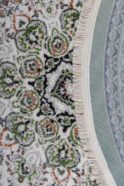 Коротко: «Ковер Amira 4923A D. Blue-L. Grey (зелёный) Овал» (Amira Oval, Elisa Rugs, Турция) — ковер для дома, гостиной. материал: полиэстер, стиль: в классическом стиле, цвет: кремовый, зеленый, ворс: 9 мм, плотность: 528000 точек/м², основа: 100% Хлопок, ориентирован на классическую подачу, страна производства: Турция.