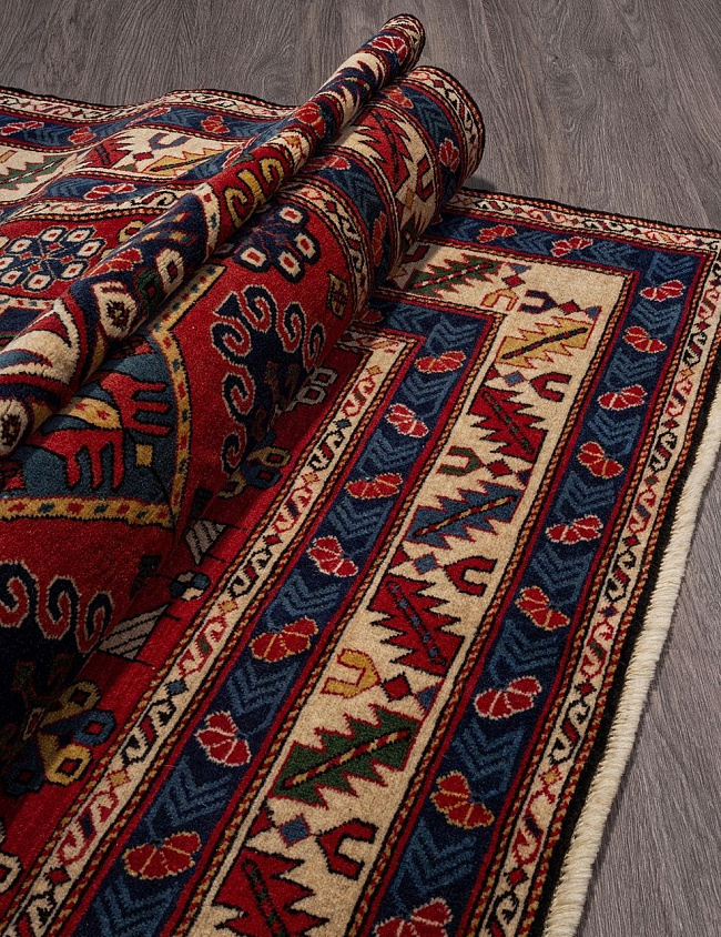 Коротко: «Ковер Azerkhalcha QARABAG 5923» (Azerkhalcha, Azerkhalcha, Азербайджан) — ковер для дома, гостиной. материал: шерсть, стиль: классический, Этно, цвет: красный, кремовый, синий, ворс: 7.9 мм, плотность: 35 точек/м², основа: 100% Хлопок, ориентирован на классическую подачу, страна производства: Азербайджан.