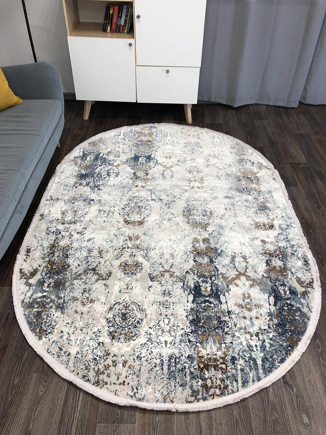 Коротко: «Ковер DOKU 9354H BLUE / CREAM Овал» (DOKU, MILAT, Турция) — ковер для дома, гостиной. материал: бамбуковый шелк 60% + Акрил 40%, стиль: в современном стиле, цвет: белый, бежевый, синий, ворс: 8 мм, плотность: 1000000 точек/м², основа: хлопок, ориентирован на классическую подачу, страна производства: Турция.
