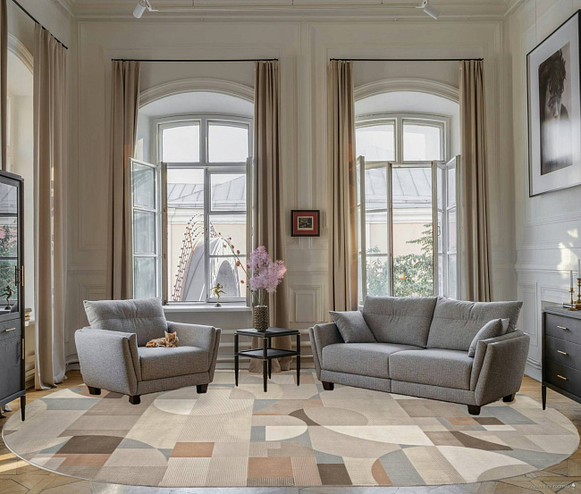 Этот ковер хорошо работает в современном интерьере, где важны чистая визуальная логика, фактура и умеренный декоративный акцент без перегруженности деталями.