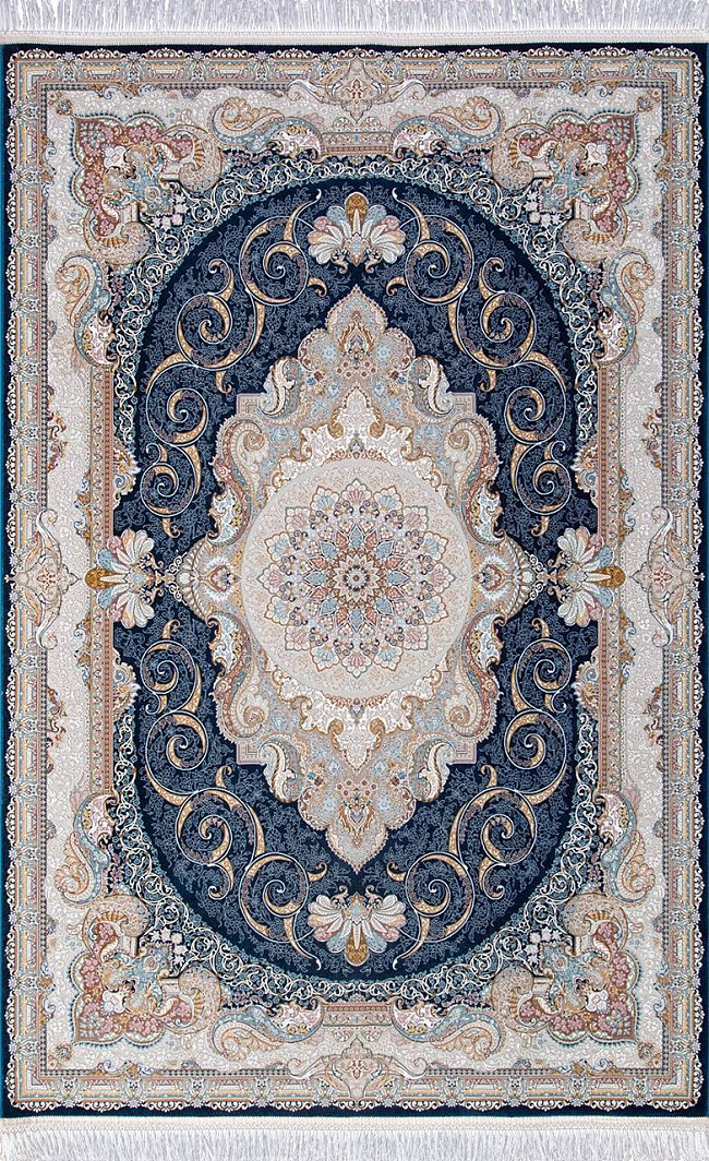 Коротко: «Ковер FARSI 1500 144 DARK BLUE» (FARSI 1500, IRANOS, Иран) — ковер для дома, гостиной. материал: акрил, стиль: в классическом стиле, цвет: кремовый, коричневый, серый, синий, ворс: 7 мм, плотность: 4500000 точек/м², основа: хлопок, ориентирован на классическую подачу, страна производства: Иран.
