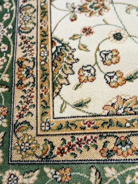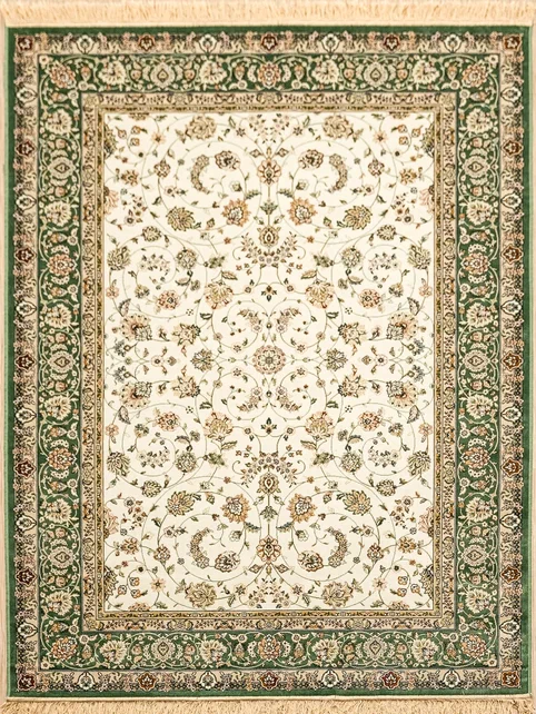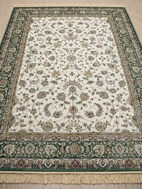Коротко: «Ковер из вискозы и хлопка Royal Palace 14295 6545» (Royal Palace UF, Ragolle) — ковер для дома, гостиной. материал: вискоза 60% + Хлопок 40 %, стиль: в классическом стиле, цвет: кремово-зеленый, ворс: 3 мм, плотность: 890000 точек/м², основа: джутовая, ориентирован на классическую подачу, страна производства: Бельгия.