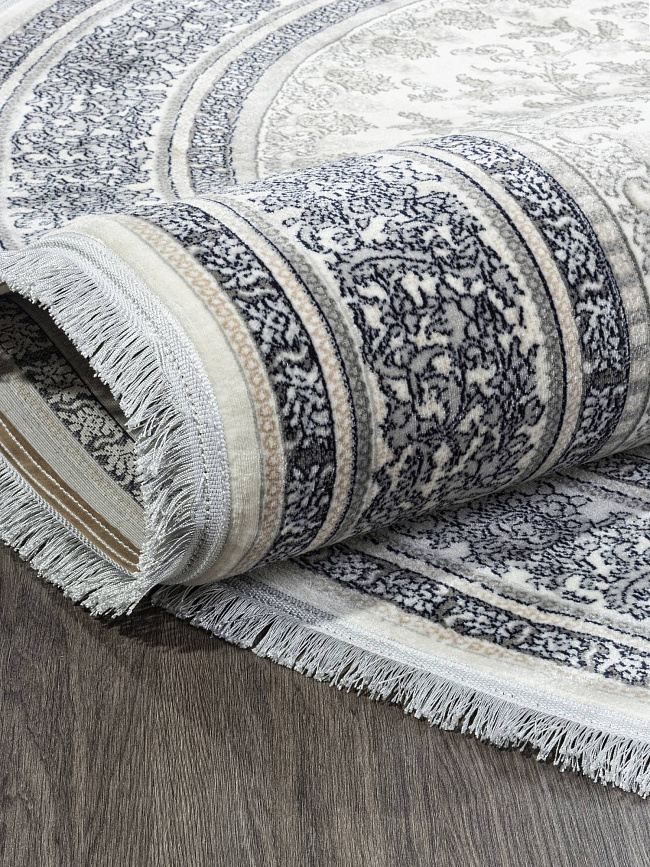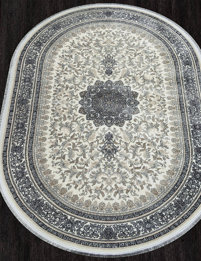 Коротко: «Ковер KASHAN 752305 000 Овал» (KASHAN, IRANOS, Иран) — ковер для дома, гостиной. материал: полипропилен, стиль: в классическом стиле, цвет: серый, бежевый, кремовый, ворс: 12 мм, плотность: 2100000 точек/м², основа: джут, ориентирован на классическую подачу, страна производства: Иран.