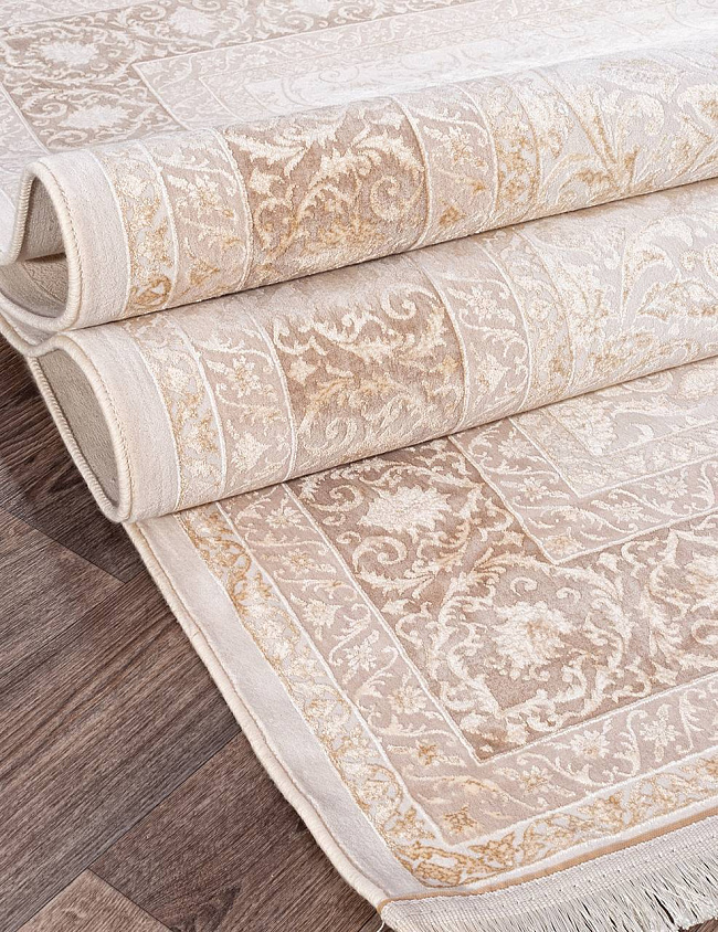 Коротко: «Ковер LOUVRE 101 CREAM» (LOUVRE, IRANOS, Иран) — ковер для дома, гостиной. материал: бамбуковый шелк, стиль: в классическом стиле, цвет: кремовый, тип ворса: Средний – 6-12 мм, 10 мм, плотность: 3600000 точек/м², основа: хлопок, ориентирован на классическую подачу, страна производства: Иран.