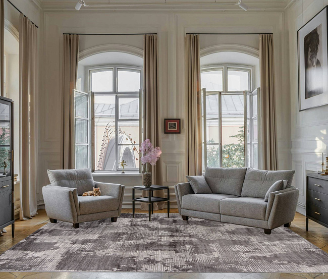 Этот ковер хорошо работает в современном интерьере, где важны чистая визуальная логика, фактура и умеренный декоративный акцент без перегруженности деталями.