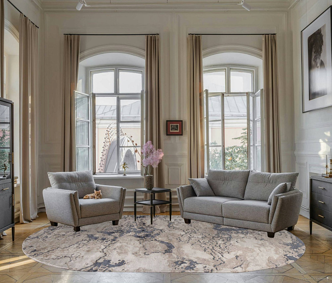 Этот ковер хорошо работает в современном интерьере, где важны чистая визуальная логика, фактура и умеренный декоративный акцент без перегруженности деталями.