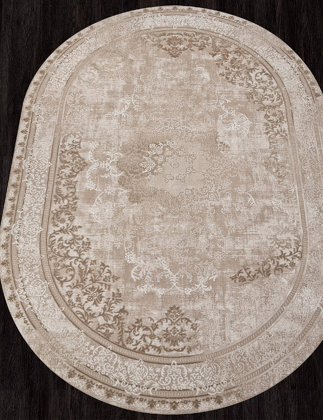 Коротко: «Ковер SIESTA M030A LIGHT BEIGE / CREAM Овал» (SIESTA, ROZA, Турция) — ковер для дома, гостиной. материал: полипропилен + Полиэстер, стиль: в классическом стиле, цвет: кремовый, бежевый, ворс: 9 мм, плотность: 576000 точек/м², основа: хлопок, ориентирован на классическую подачу, страна производства: Турция.