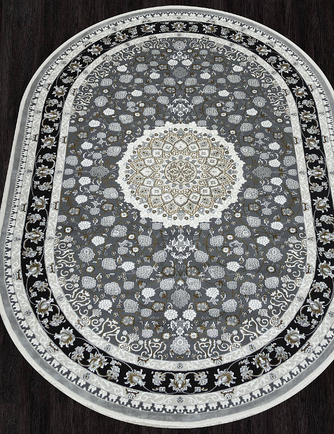 Коротко: «Ковер MIRAY O1467 090 BLACK Овал» (MIRAY, MERINOS) — ковер для дома, гостиной. материал: полиэстер, стиль: в классическом стиле, цвет: серый, черный, ворс: 9 мм, плотность: 560000 точек/м², основа: хлопок, ориентирован на классическую подачу, страна производства: Турция.