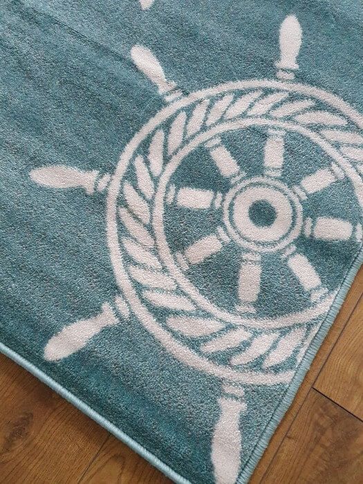 Коротко: «Ковер МОРСКОЙ со ШТУРВАЛОМ лазурный» (Creative Carpets - machine made, Люберецкие ковры) — ковер для дачи, детского сада. материал: полипропилен, стиль: детский, цвет: лазурный, ворс: 8 мм, плотность: 320000 точек/м², основа: джутовая, подходит для детского интерьера, страна производства: Россия.