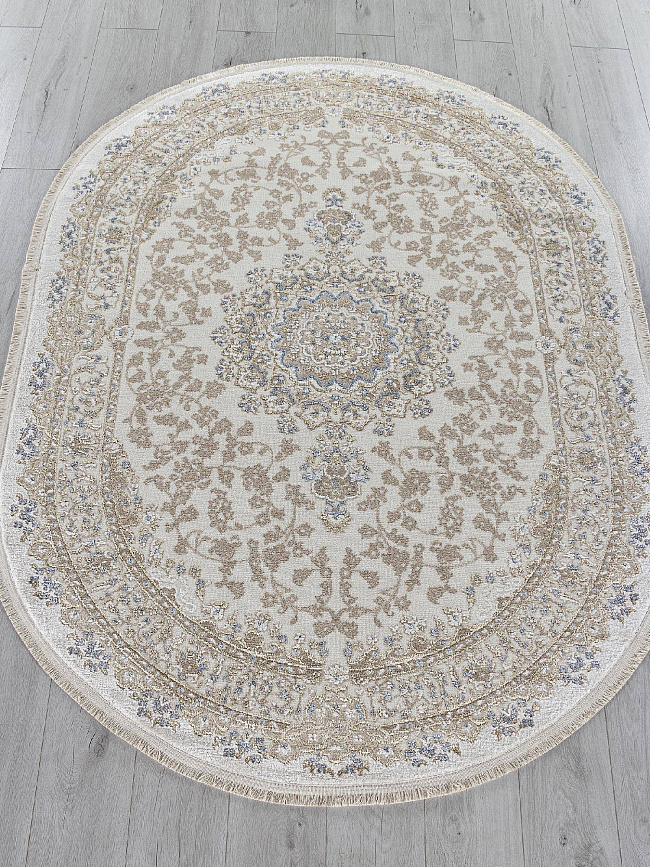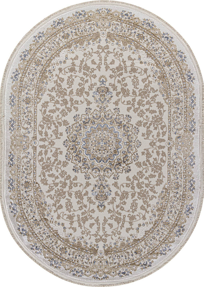 Коротко: «Ковер MOSSO 27239 CREAM / BLUE Овал» (MOSSO, KARDELEN, Турция) — ковер для дома, гостиной. материал: полипропилен + Полиэстер, стиль: в классическом стиле, цвет: кремовый, бежевый, синий, ворс: 8 мм, плотность: 256000 точек/м², основа: джут, ориентирован на классическую подачу, страна производства: Турция.