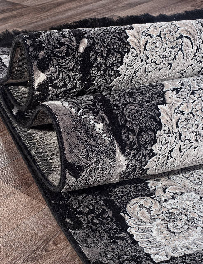 Коротко: «Ковер MUSKAT 1200 90119 000» (MUSKAT 1200, IRANOS, Иран) — ковер для дома, гостиной. материал: бамбуковый шелк, стиль: в классическом стиле, цвет: черный, серый, тип ворса: Короткий, плотность: 3600000 точек/м², основа: хлопок, ориентирован на классическую подачу, страна производства: Иран.