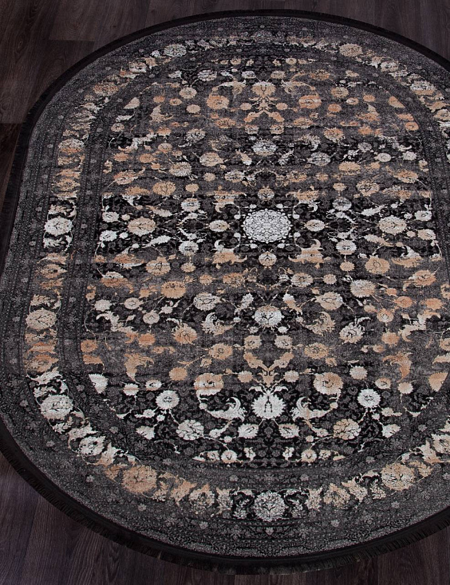 Коротко: «Ковер MUSKAT 1200 9044 000 Овал» (MUSKAT 1200, IRANOS, Иран) — ковер для дома, гостиной. материал: бамбуковый шелк, стиль: в классическом стиле, цвет: серый, черный, бежевый, тип ворса: Короткий, плотность: 3600000 точек/м², основа: хлопок, ориентирован на классическую подачу, страна производства: Иран.