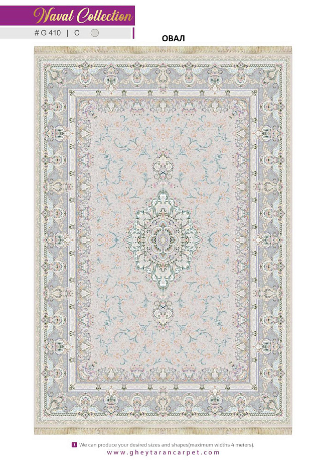Коротко: «Ковер NAVAL 1200 VISCOSE ACRYLIC G410 C 000 Овал» (NAVAL 1200 VISCOSE ACRYLIC) — ковер. ворс: 7 мм, плотность: 3600000 точек/м², основа: хлопок, страна производства: Иран.