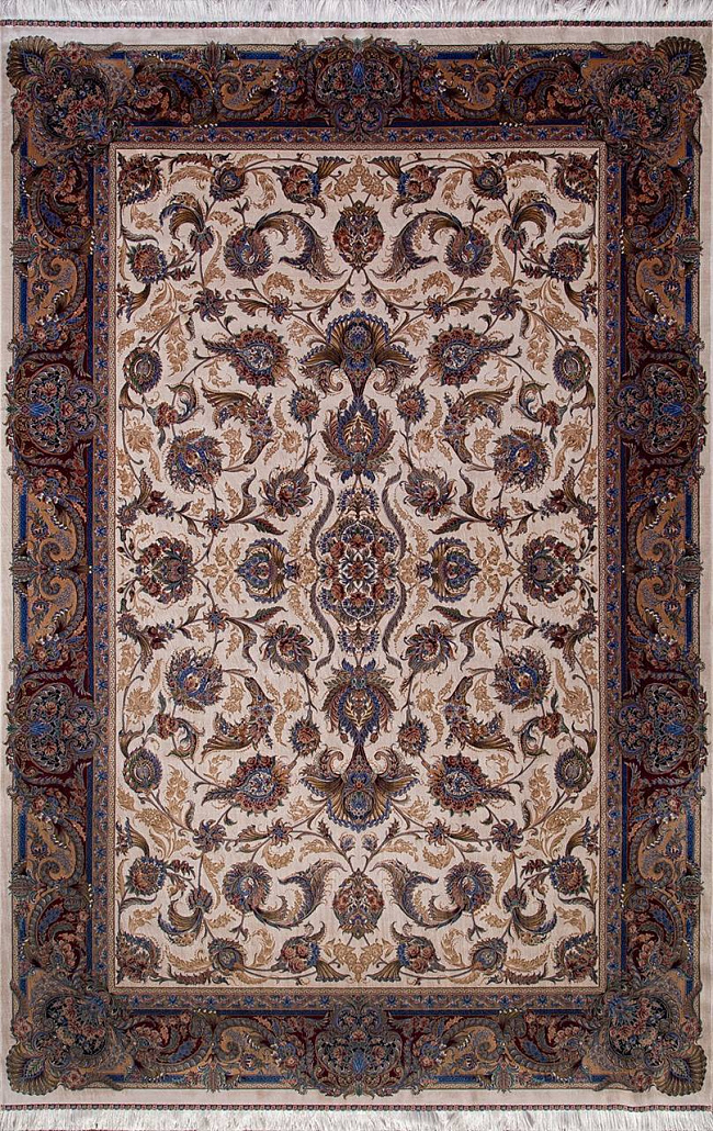 Коротко: «Ковер QUM 602 CREAM» (QUM, IRANOS, Иран) — ковер для дома, гостиной. материал: бамбуковый шелк, стиль: в классическом стиле, цвет: бежевый, коричневый, синий, тип ворса: Средний – 6-12 мм, плотность: 3600000 точек/м², основа: хлопок, ориентирован на классическую подачу, страна производства: Иран.