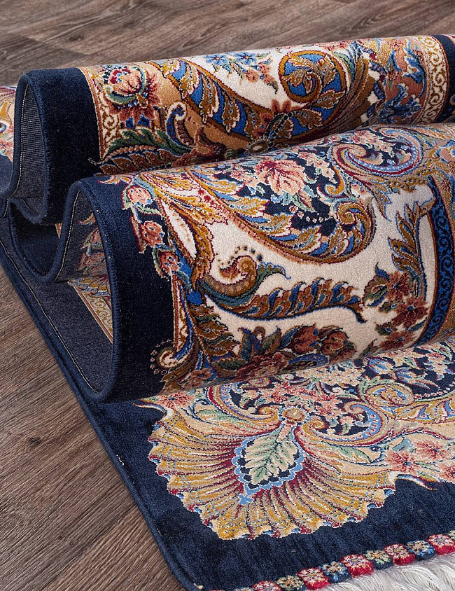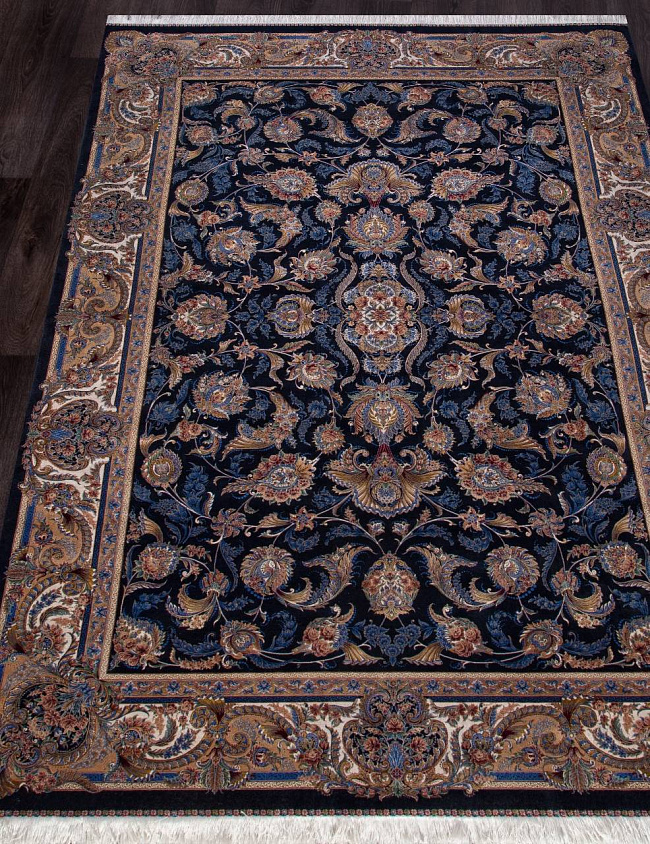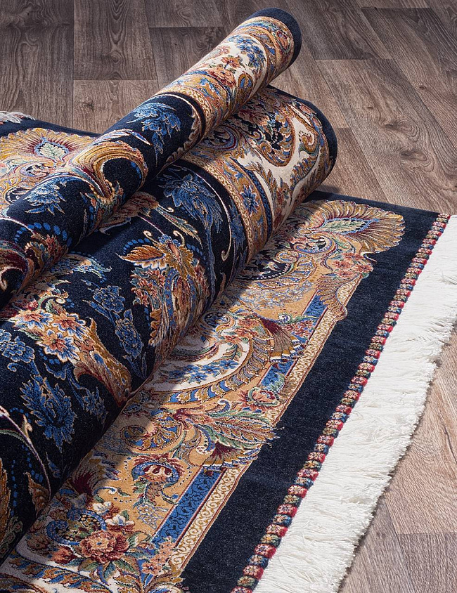 Коротко: «Ковер QUM 602 NAVY» (QUM, IRANOS, Иран) — ковер для дома, гостиной. материал: бамбуковый шелк, стиль: в классическом стиле, цвет: коричневый, бежевый, синий, тип ворса: Средний – 6-12 мм, плотность: 3600000 точек/м², основа: хлопок, ориентирован на классическую подачу, страна производства: Иран.