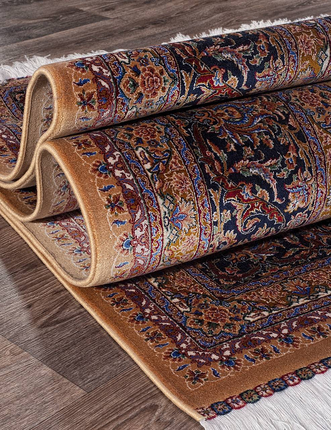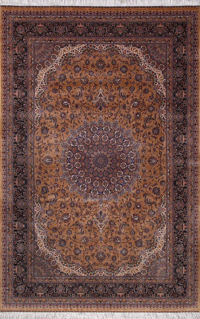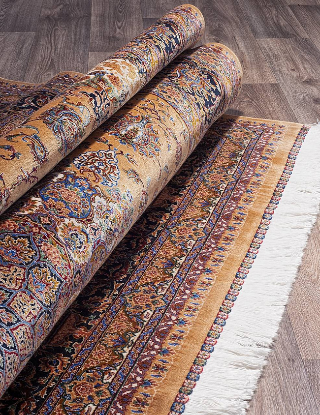 Коротко: «Ковер QUM 603 YELLOW» (QUM, IRANOS, Иран) — ковер для дома, гостиной. материал: бамбуковый шелк, стиль: в классическом стиле, цвет: бежевый, коричневый, тип ворса: Средний – 6-12 мм, плотность: 3600000 точек/м², основа: хлопок, ориентирован на классическую подачу, страна производства: Иран.