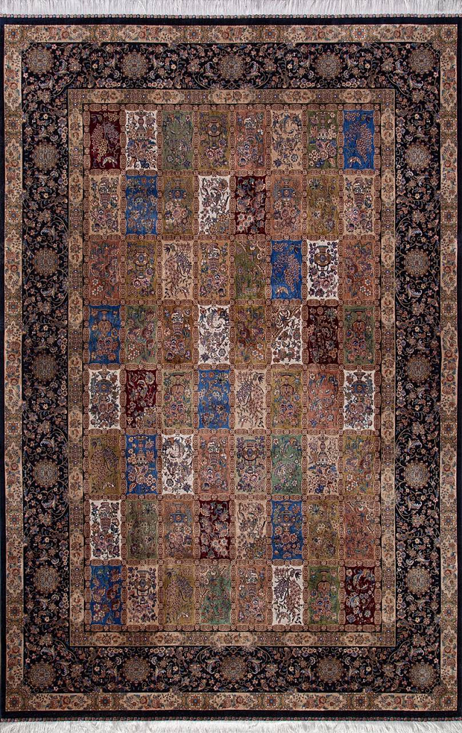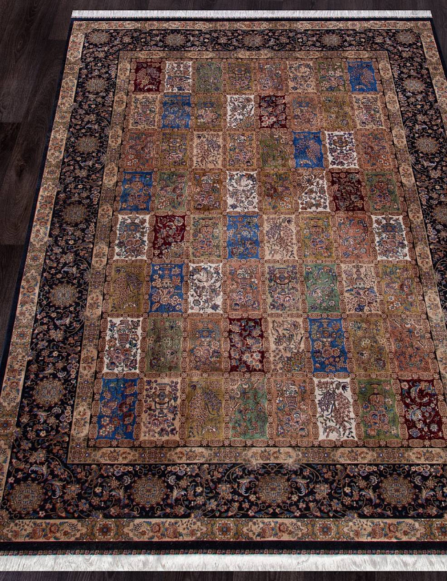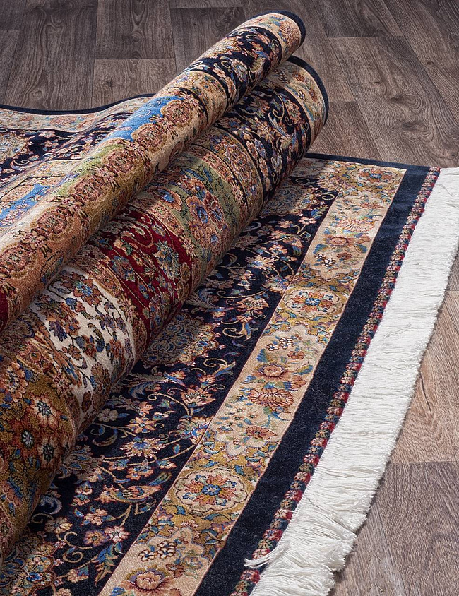 Коротко: «Ковер QUM 611 NAVY» (QUM, IRANOS, Иран) — ковер для дома, гостиной. материал: бамбуковый шелк, стиль: в классическом стиле, цвет: синий, бежевый, коричневый, тип ворса: Средний – 6-12 мм, плотность: 3600000 точек/м², основа: хлопок, ориентирован на классическую подачу, страна производства: Иран.