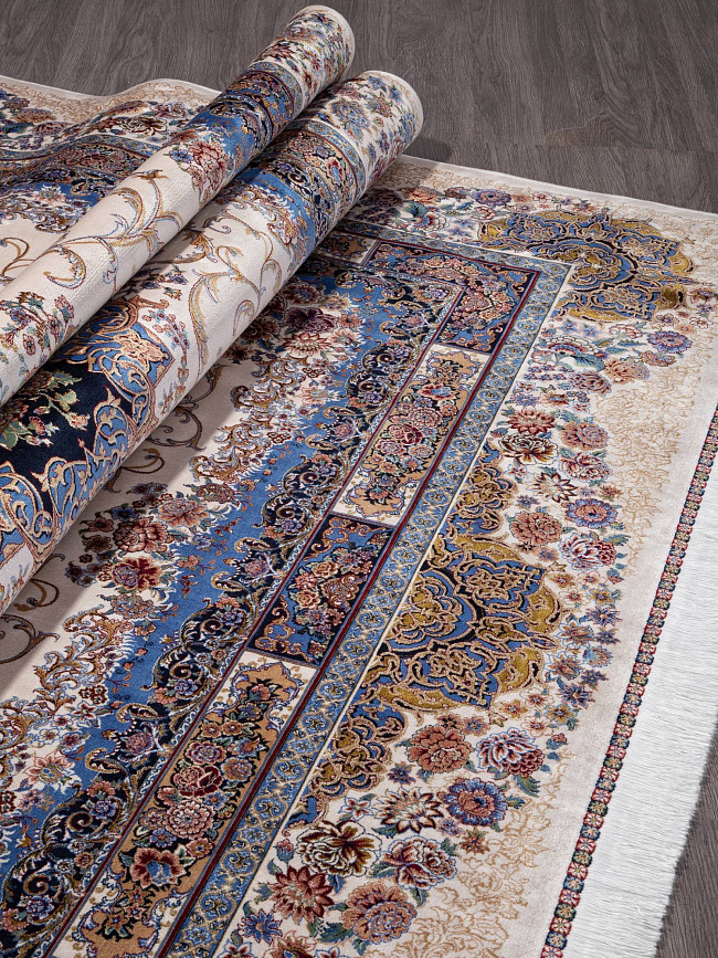Коротко: «Ковер QUM 632 CREAM» (QUM, IRANOS, Иран) — ковер для дома, гостиной. материал: бамбуковый шелк, стиль: в классическом стиле, цвет: бежевый, коричневый, синий, тип ворса: Средний – 6-12 мм, плотность: 3600000 точек/м², основа: хлопок, ориентирован на классическую подачу, страна производства: Иран.