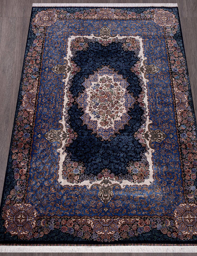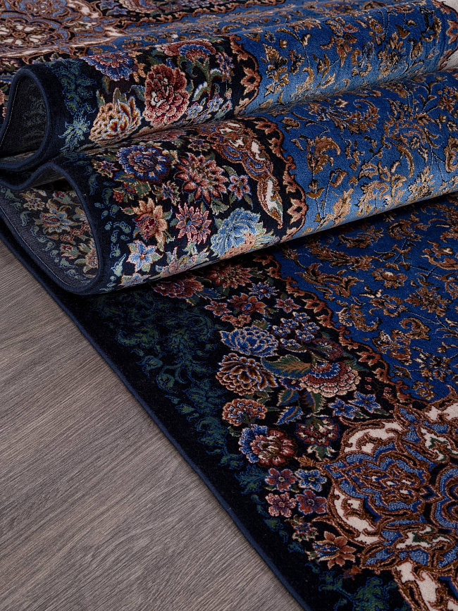 Коротко: «Ковер QUM 633 NAVY» (QUM, IRANOS, Иран) — ковер для дома, гостиной. материал: бамбуковый шелк, стиль: в классическом стиле, цвет: синий, бежевый, коричневый, тип ворса: Средний – 6-12 мм, плотность: 3600000 точек/м², основа: хлопок, ориентирован на классическую подачу, страна производства: Иран.