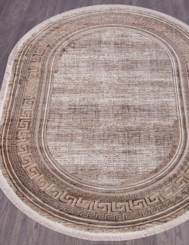 Коротко: «Ковер REGINA O0274 065 VIZON Овал» (REGINA, MERINOS, Турция) — ковер для дома, гостиной. материал: полиэстер + Полипропилен, стиль: в современном стиле, цвет: бежевый, коричневый, ворс: 8 мм, плотность: 390000 точек/м², основа: джут, подходит для современного интерьера, страна производства: Турция.