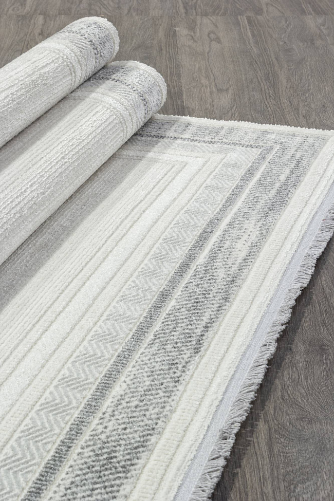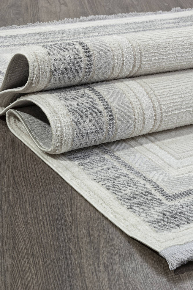 Коротко: «Ковер RUBI 26376A CREAM / CREAM» (RUBI, DURKAR, Турция) — ковер для дома, гостиной. материал: полиэстер + Полипропилен, стиль: в современном стиле, цвет: кремовый, серый, ворс: 9 мм, плотность: 440000 точек/м², основа: хлопок, подходит для современного интерьера, страна производства: Турция.