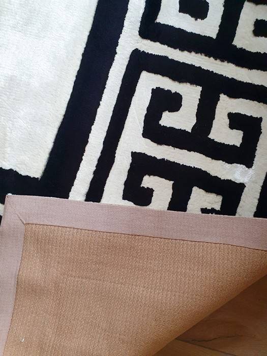 Коротко: «Ковер ручной работы МЕАНДР white and black» (Creative Carpets - hand made, DEKOS) — ковер для гостиной, кабинета. материал: бамбуковый шелк, стиль: классический, Модерн, цвет: черно-белый, ворс: 12 мм, основа: тканевая, ориентирован на классическую подачу, страна производства: Турция.