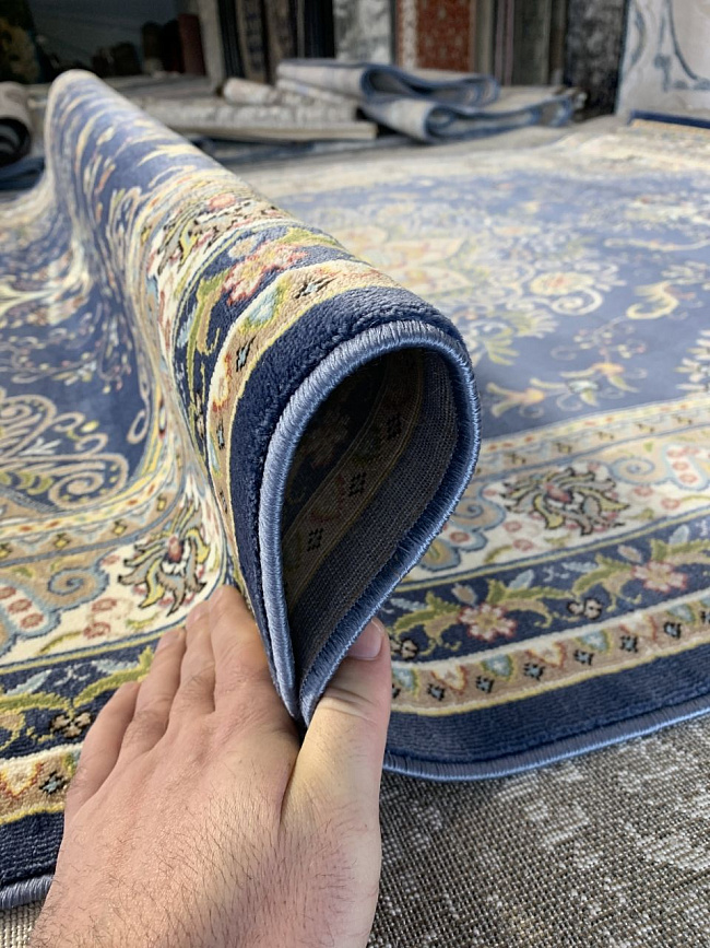 Коротко: «Ковер RUSYA DENEME NJ046 035» (RUSYA DENEME, MERINOS, Турция) — ковер для дома, гостиной. материал: полипропилен, стиль: в классическом стиле, цвет: синий, бежевый, коричневый, ворс: 10 мм, плотность: 921600 точек/м², основа: джутовая, ориентирован на классическую подачу, страна производства: Турция.