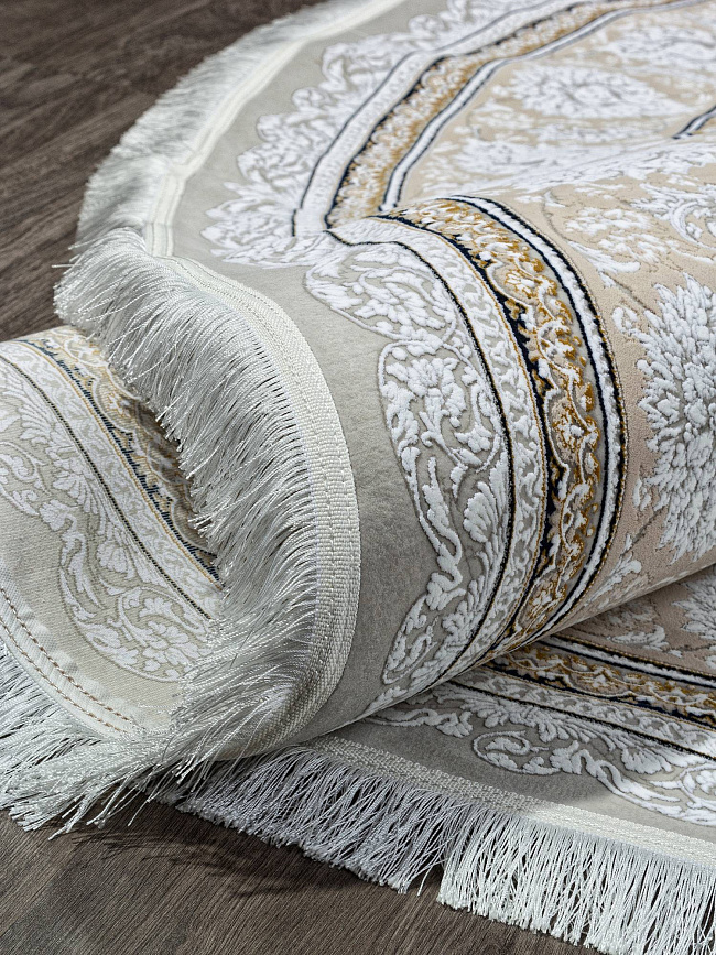 Коротко: «Ковер SALIMA 8006 000 Круг» (SALIMA, IRANOS, Иран) — ковер для дома, гостиной. материал: акрил, стиль: в классическом стиле, цвет: кремовый, бежевый, ворс: 7 мм, плотность: 3600000 точек/м², основа: хлопок, ориентирован на классическую подачу, страна производства: Иран.