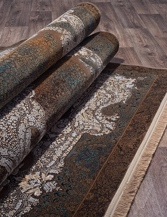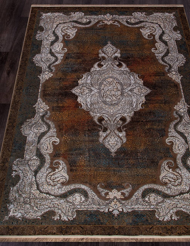 Коротко: «Ковер SHEIKH 9224 СЕРЫЙ / КОРИЧНЕВЫЙ» (SHEIKH, IRANOS, Иран) — ковер для дома, гостиной. материал: бамбуковый шелк, стиль: в классическом стиле, цвет: коричневый, тип ворса: Короткий, плотность: 3600000 точек/м², основа: джут, ориентирован на классическую подачу, страна производства: Иран.