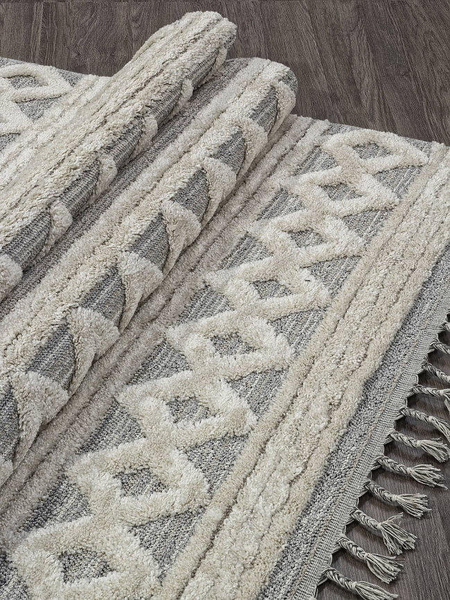 Коротко: «Ковер TUNIS 6608B WHITE / L. GRAY» (TUNIS, MILAT, Турция) — ковер для дома, гостиной. материал: полипропилен + Полиэстер, стиль: в современном стиле, цвет: кремовый, серый, ворс: 20 мм, плотность: 89000 точек/м², основа: хлопок, подходит для современного интерьера, страна производства: Турция.