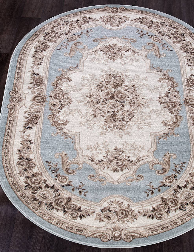 Коротко: «Ковер VALENCIA ДЕЛЮКС 4015 L. BLUE-BROWN Овал» (VALENCIA DELUXE, MERINOS) — ковер для дома, гостиной. материал: полипропилен, стиль: в классическом стиле, цвет: кремовый, голубой, ворс: 8 мм, плотность: 304000 точек/м², основа: джут, ориентирован на классическую подачу, страна производства: Россия.