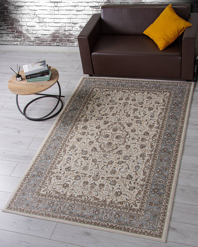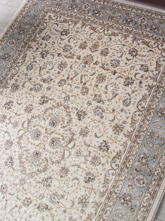 Коротко: «Ковер VALENCIA DELUXE F014 CREAM-L. BLUE» (VALENCIA DELUXE, MERINOS) — ковер для дома, гостиной. материал: полипропилен, стиль: в классическом стиле, цвет: кремовый, серый, голубой, ворс: 8 мм, плотность: 304000 точек/м², основа: джут, ориентирован на классическую подачу, страна производства: Россия.