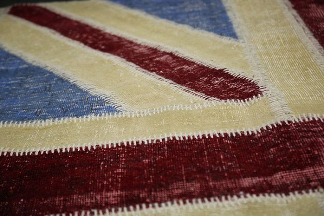 Коротко: «Ковер винтажный ручной работы Британский флаг Vintage Flag Patchwork 230315» (Vintage, Ornate Carpets) — ковер для дома, гостиной. материал: шерсть, стиль: современный, Английский, Лофт, Модерн, Винтажный, цвет: сине-красный, ворс: 4 мм, плотность: 1000000 точек/м², основа: тканевая, подходит для современного интерьера, страна производства: Великобритания.