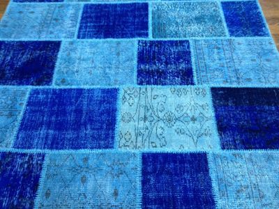 Коротко: «Ковер винтажный ручной работы Vintage Look at Me Cubes blue» (Vintage, Zadeh) — ковер для дома, гостиной. материал: шерсть, стиль: лофт, Модерн, Винтажный, цвет: сине-голубой, ворс: 5 мм, плотность: 1000000 точек/м², основа: джутовая, подходит для современного интерьера, страна производства: Иран.