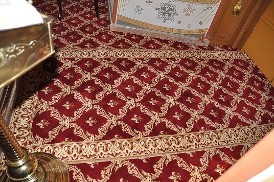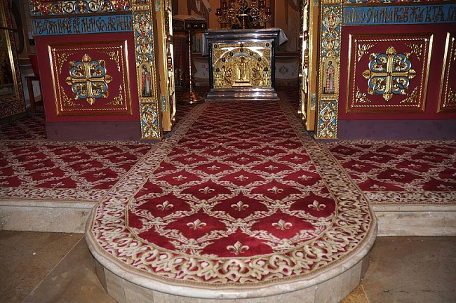 Коротко: «Ковровое покрытие с укладкой в храм» (Ковровое покрытие, Витебские ковры) — ковер. материал: шерсть 35%+ ПАН 45%+ ПА 25%, цвет: бордовый, ворс: 6 мм, плотность: 500000 точек/м², основа: джутовая, ориентирован на классическую подачу.