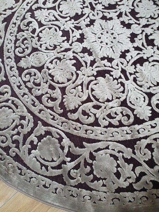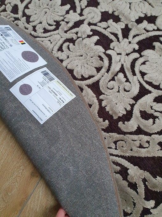 Коротко: «Рельефный ковер из вискозы GENOVA 38064 7575 70 КРУГ» (Genova UF round, Ragolle) — ковер для прикроватной зоны, дома. материал: вискоза 80% + Акрил 20%, стиль: английский, Классический, Восточный, цвет: темно-коричневый с серым, ворс: 5 мм, плотность: 1000000 точек/м², основа: джутовая, ориентирован на классическую подачу, страна производства: Бельгия.