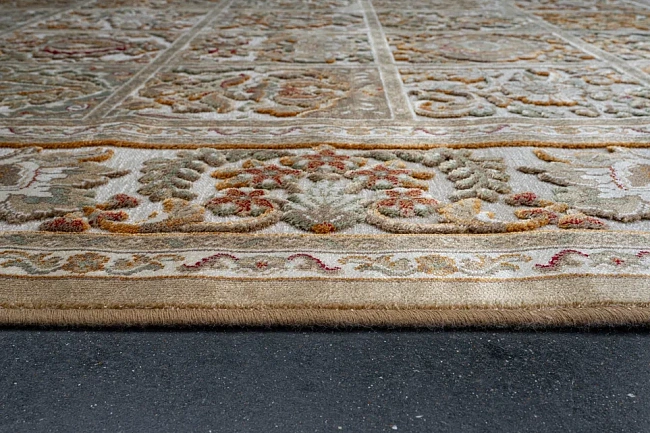Коротко: «Рельефный ковер из вискозы GENOVA 38354 6222 60» (Genova UF, Ragolle) — ковер для прикроватной зоны, дома. материал: вискоза 80% + Акрил 20%, стиль: английский, Классический, Восточный, цвет: светло-коричневый, ворс: 5 мм, плотность: 1000000 точек/м², основа: джутовая, ориентирован на классическую подачу, страна производства: Бельгия.